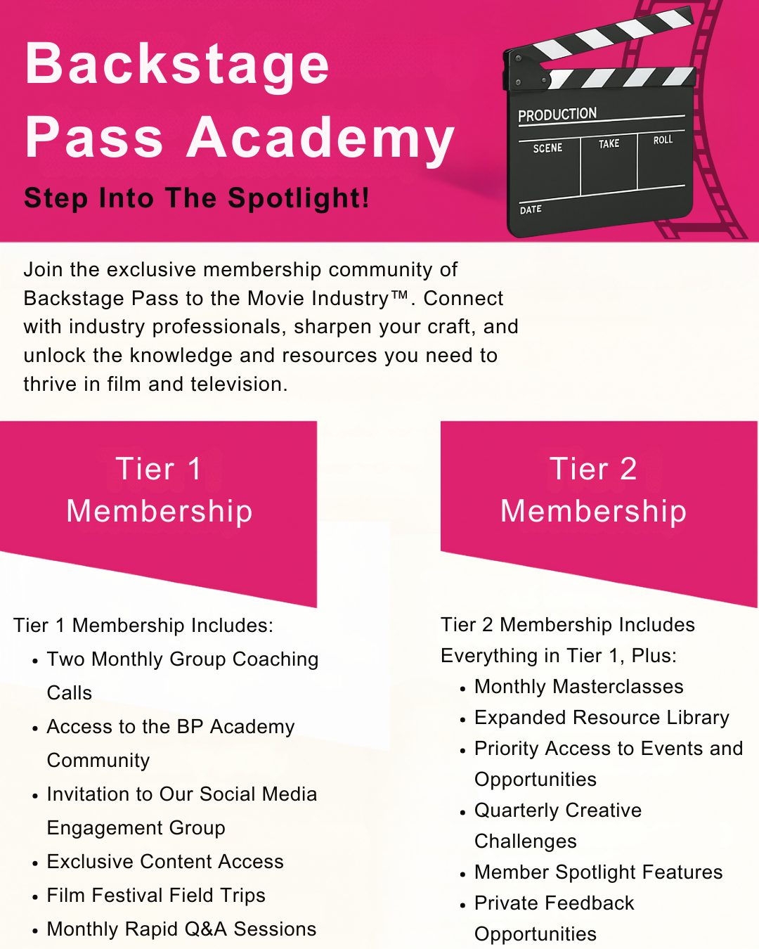 Backstage Pass Academy (BP Academy) represents the membership division of "Backstage Pass to the Movie Industry®." This segment prioritizes fostering learning in a familial setting. BP Academy offers a cutting-edge platform for peer-to-peer coaching, ideal for those keen on delving into the entertainment industry. Our program includes bimonthly group coaching sessions featuring seasoned guest speakers. At a highly affordable rate, our learners garner insights and guidance on navigating a successful career in the entertainment world. Our expert mentors highlight potential pitfalls and passionately impart their wisdom to help you steer clear of the mistakes they've previously encountered. Having experience across all facets of the entertainment industry, our professionals can help you transition from dreaming about your passion to actively pursuing it in reality.